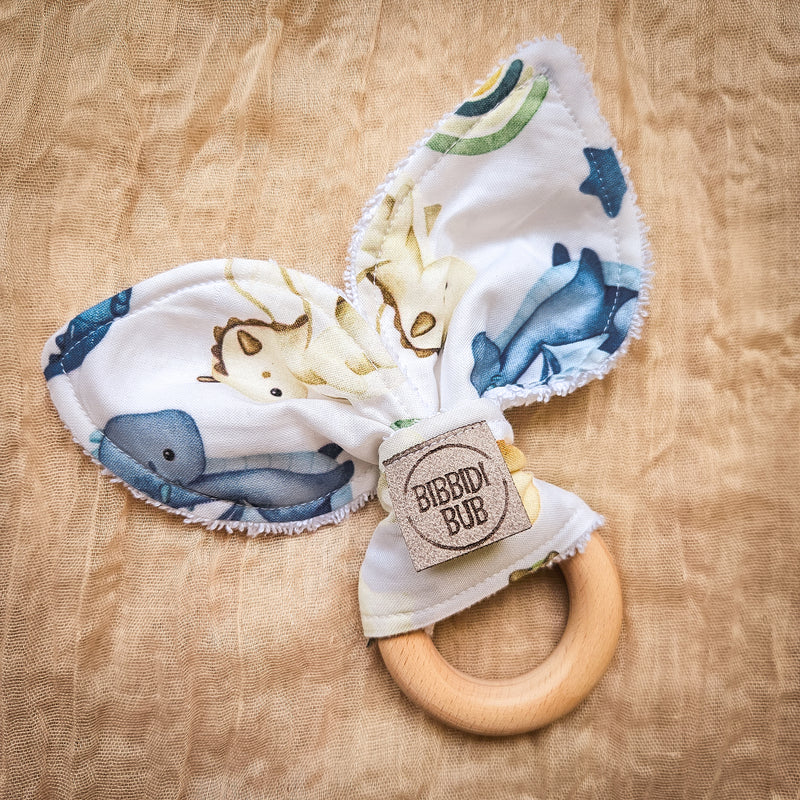 My teethers are made with cotton fabric and backed with terry toweling to soak up all that drool while entertaining bubs. The ring is made from A grade wood that can be wiped clean. The wood is untreated however can be conditioned with your favourite natural oil.