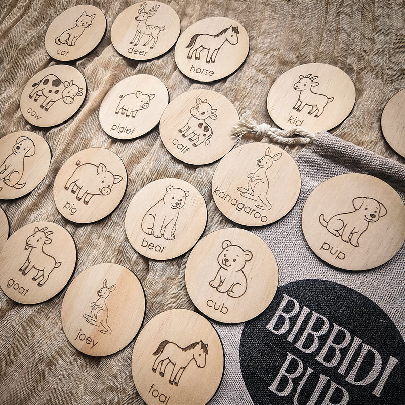 The set includes 9 matching pairs (18 discs) of discs featuring an adult animal and baby animal. Duck, Duckling, Cow, Calf, Goar, Kid, Deer, Fawn, Cat, Kitten, Kangaroo, Joey, Pig, Piglet, Bear, Cub, Horse, Fowl.