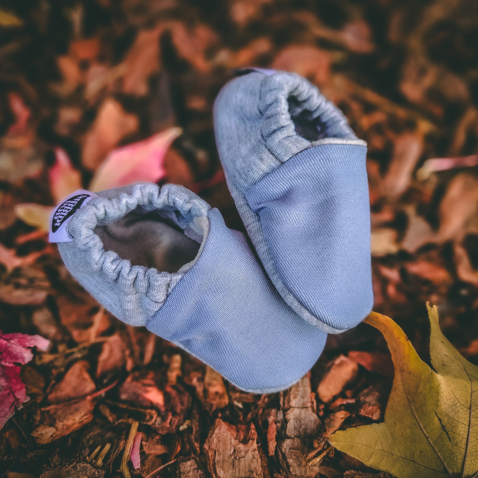 Our soft sole shoes are made from cotton and sports fleece. They have elastic around the ankle so they don't fall off those kicking baby feet.
